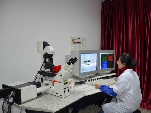 仪器说明:制造商:德国Leica,型号:Leica Tcs Sp2。激光源包括HeNe633nm、HeNe 543nm和Ar458 nm/476nm/ 488nm/514nm 三支激光管,在计算机工作站控制下可以同时进行3个荧光通道和一个透射光通道的观察。