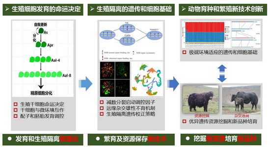 实验室成立于2015年,负责人为杨其恩研究员。实验室由研究员、副研究员、助理研究员、研究生、访问学者和技术人员近二十人组成,成员入选多项中国科学院和青海省人才计划。实验室目前主要使用动物分子生物学、生理学、遗传学和基因组学等多组学手段,利用生殖干细胞体外培养体系、移植技术和基因编辑技术,以模式小鼠和高原特有动物为模型,系统研究:1)哺乳动物雄性生殖干细胞命运决定;2)动物种间杂交雄性不育的分子调控途径;3)牦牛藏羊遗传资源挖掘与创新利用。目前承担国家重点研发计划课题、中国科学院A类先导专题、国家自然科学基金区域重点项目、国家自然科学基金面上项目、青海省重大专项和自然基金团队项目等。在 Nature Communications,Cell Reports,Journal of Advanced Research,Development,PLoS Genetics, Stem Cell Reports, Journal of Cell Science, Cellular and Molecular Life Sciences, Journal of Animal Science & Biotechnology, Journal of Dairy Science,Biology of Reproduction等期刊发表论文70余篇,参编中英文专著3部,支撑挖掘玉树牦牛、环湖牦牛、雪多牦牛、泽库羊、玛多羊等国家级遗传资源7个,制定地方标准3项。
