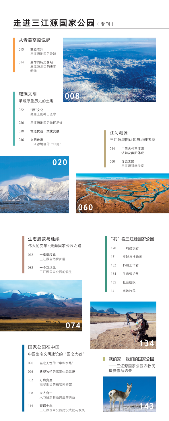 三江源国家公园专刊主要包括“从青藏高原说起”“璀璨文明”“江河溯源”“生态启蒙与延续”“国家公园在中国”“‘我’看三江源国家公园”“我的家 我们的国家公园”7大板块,邀请国内生态、历史、文化、动植物、地质、地图等领域共15位专家撰写文章21篇,采访参与三江源国家公园建设的一线干部职工、农牧民、企业及NGO组织负责人等14人,版面字数达20余万字。为提升质量,打造精品,出版方充分发挥地图及影像优势,以图文并茂的形式穿插高清摄影图72幅、古地图44幅、地图17幅、卫星影像图6幅、插图8幅,经历时一年的采编、打磨、反复征求意见、多次召开审查评审会,该专刊具有较高的权威性、可读性、观赏性,为社会公众了解三江源的前世今生、独特的生态价值、实行最严格保护的重大意义提供了不可多得的窗口与机会。