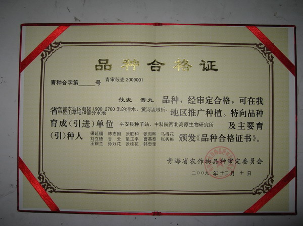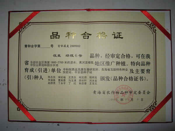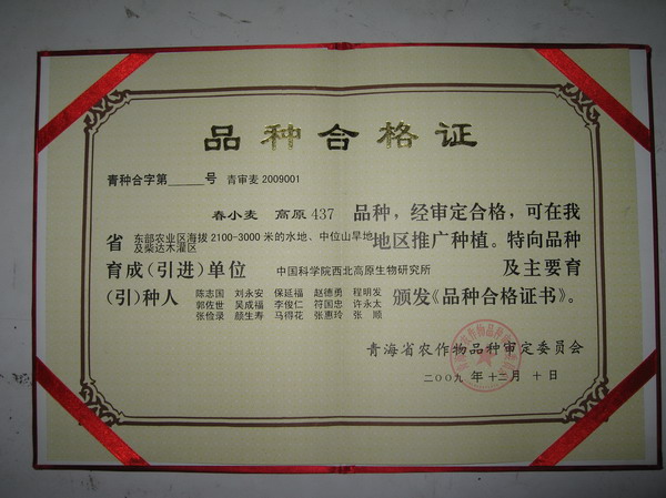 2009年12月10日,青海省第七届农作物品种审定委员会第四次会议在西宁召开,西北高原所陈志国研究员培育的春小麦新品种高原437和两个引进莜麦新品种坝莜6号、晋九通过审定。