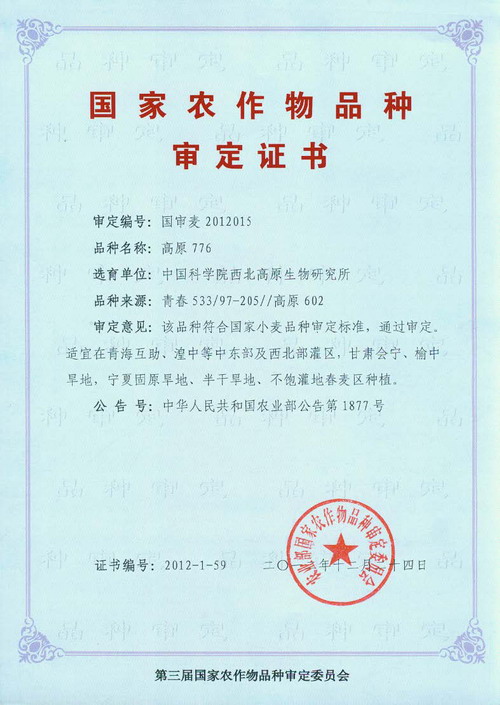 由西北高原生物研究所陈志国研究员培育的春小麦新品种“高原776”经第三届国家农作物品种审定委员会第一次会议审定通过,并已由中华人民共和国农业部公告第1877号公告。