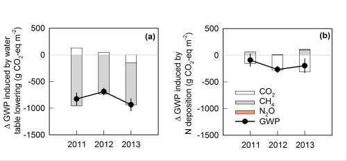 水位降低(a)和氮沉降(b)对全球变暖潜势(GWP)的影响