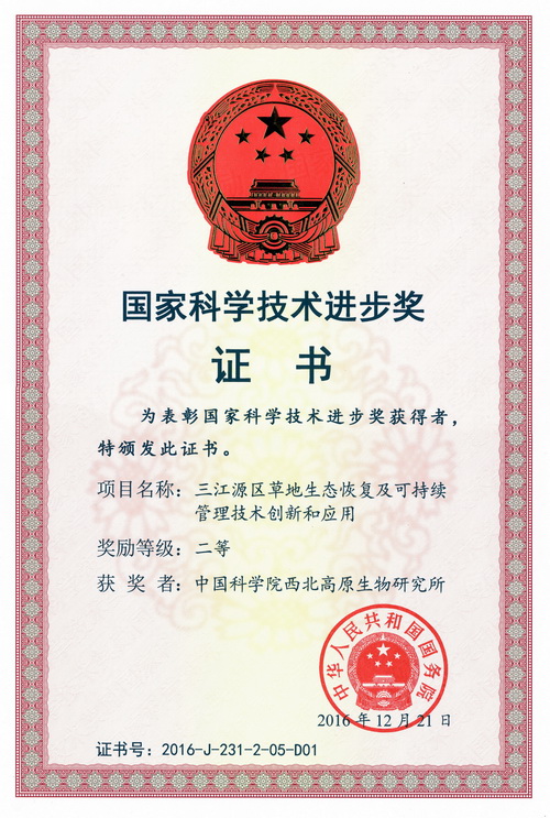 1月9日上午,2016年度国家科学技术奖励大会在人民大会堂举行。中国科学院西北高原生物研究所作为第一完成单位,与青海大学、青海省畜牧兽医科学院、西南民族大学、青海省牧草良种繁殖和青海师范大学共同完成的“三江源区草地生态恢复及可持续管理技术创新和应用 ”成果获国家科学技术进步奖二等奖,成果第一完成人赵新全研究员代表项目组领奖。