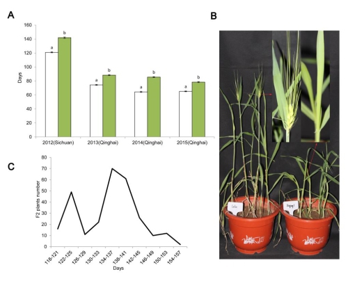 Fig. 1 Variation in the flowering time of Lalu and Diqing 1 plants grown in Sichuan and Qinghai. a Days to flowering (mean number of days to reach awn emergence on the leading tiller) of Lalu (white bars) and Diqing 1 (green bars). The error bars represent the standard error calculated from 19 Lalu plants and 13 Diqing 1 plants grown in Sichuan in 2012, and from 15 Lalu and 15 Diqing 1 plants grown in Qinghai in 2013-2015. b 60 day old plants of Lalu (left) and Diqing 1 (right). The arrows indicate the region of the leading tiller shown in magnified form. c The distribution of flowering time exhibited by the F2 progeny of the cross Lalu × Diqing 1.