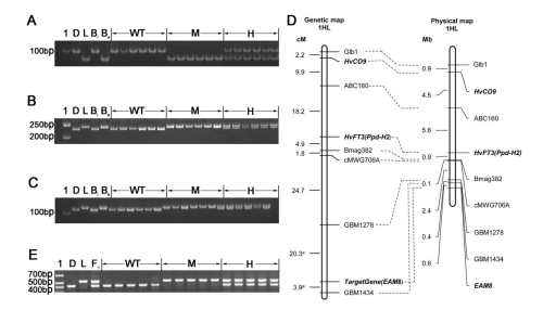 Fig. 2 Mapping the gene underlying early flowering in Lalu. Amplicons obtained from the SSR assays a Bmag382, b GBM1278 and c GBM1434. d A genetic (left) and a physical (right) map of the region of chromosome arm 1HL where the gene was located. The genetic map incorporates loci mapped by Kikuchi et al. (2012). e Amplicons obtained from a PCR assay based on the primer pair EAM8-2822-F/EAM8-3235-R, which targets the 104 bp indel in intron 2. 1: Molecular weight marker, D: Diqing1, L: Lalu, Be: a DNA bulk prepared from 20 early flowering F2 segregants; Bl: a DNA bulk prepared from 20 late flowering F2 segregants, WT: homozygote for the Diqing 1 allele, M: homozygote for the Lalu allele, H: heterozygote, F1: Lalu × Diqing 1 F1 plant.