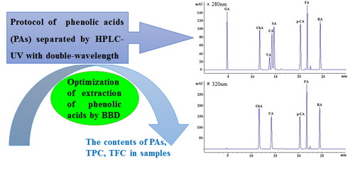 Abstract: The utilization of Caragana korshinskii Kom. (CK) is currently concentrated on its ecological and fuel functions. Little attention has been devoted to the analysis of their phenolic acid (PA) components. To obtain more data for further utilization of CK, a new analysis protocol was tested to determine PAs synchronously by RP-HPLC-UV with double-wavelength (280 nm and 320 nm) detection. Specifically, separation of PA components was performed on a Hypersil Gold C18 reverse phase column with gradient elution. A four-factor-three-level Box-Behnken design was implemented for optimization of PA extraction. The results demonstrated that CK were rich primarily in chlorogenic acid, vanillic acid, caffeic acid and rosmarinic acid. The total content of PAs in CK leaves was the highest compared with its other parts. The distribution of total flavonoid content of CK was leaves > flowers > bark, while that of the total phenolic content of CK was flowers > leaves > bark.