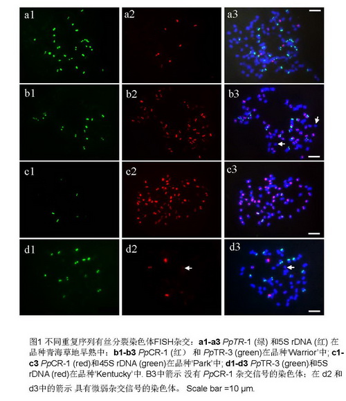 本项研究通过构建草地早熟禾重复序列DNA文库,采用染色体荧光原位杂交(FISH)筛选技术,分离和鉴定出了4个全新的草地早熟禾染色体标记:PpTR-1, PpTR-2, PpTR-3及PpCR-1。其中PpTR-1, PpTR-2, PpTR-3为染色体端部区域分布重复序列,重复单元长度分别为 318 bp, 189 bp 和189 bp;PpCR-1为着丝粒或近着丝粒区域分布重复序列,重复单元长度为27bp。PpTR-1, PpTR-2,和PpTR-3的染色体分布方式在不同草地早熟禾品种间及草地早熟禾近缘种间具有较高的保守性;PpCR-1的分布方式在不同草地早熟禾品种间具有保守性,但是在不同近缘种间变异较大。同时文中揭示,青海草地早熟禾品种PpTR-3和PpCR-1杂交信号数量显著少于从美国进口的品种。本研究开发出的染色体标记可作为揭示草地早熟基因组组成、不同品种及种质染色体特征以及揭示草地早地早熟禾无融合生殖的遗传规律的有力工具。