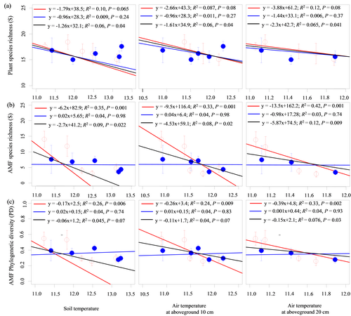 植物群落物种丰富度(a)、系统发育多样性(b)、AMF群落物种丰富度(c)与土壤温度、大气温度的一元线性回归