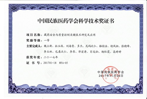 “藏药安全与质量控制关键技术研究及应用”成果获2017年度中国民族医药学会科学技术奖一等奖