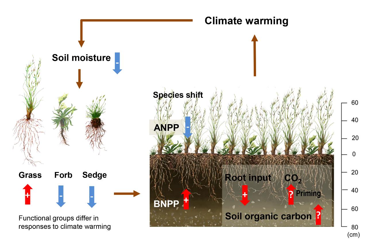 研究发现,尽管过去32年以来海北站气候呈现暖干化的趋势,但草地生产力无显著趋势性变化。与此同时,草地物种组成却发生了明显改变,即深根系的禾草增加、浅根系的莎草减少。这种功能群组成的变化增强了植物群落对深层土壤水分的获取能力,有利于气候变化下生态系统初级生产力的稳定。气候变化控制实验进一步证明,增温和干旱处理有利于光合产物向地下分配,但对总初级生产力无显著影响。Meta分析证实了气候变暖条件下物种组成改变在整个高原普遍存在。这些结果表明,青藏高原高寒草地生产力并不像以前认为的对气候变化极其敏感;更重要的是,高寒草地植物物种多样性在气候变化下生产力维持过程中起着关键作用。如果未来植物多样性丧失,高寒草地对气候变化的缓冲作用降低,就会威胁到生态系统的服务功能。