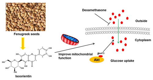 ABSTRACT 1: Fenugreek is a well known annual herb widely used in both medicine and food. Four flavonoid glycosides have been separated from fenugreek seeds in our previous study. In this study, the effects of the four flavonoid glycosides on regulating glycolipid metabolism and improving mitochondrial function were investigated. Isoorientin showed a very significant activity among these flavonoid glycosides. First, isoorientin decreased the accumulation of lipid droplets in 3T3-L1 preadipocytes by reducing the expression of adipokines including PPARγ, C/EBPα, and FAS. Second, isoorientin restored insulin-stimulated glucose uptake in dexamethasone-induced insulin-resistant 3T3-L1 adipocytes by reactivating Akt and AMPK. Finally, isoorientin improved mitochondrial dysfunction induced by dexamethasone in 3T3-L1 adipocytes. Isoorientin also reversed dexamethasoneinduced decrease in mitochondrial membrane potential (MMP) and intracellular ATP production, reduced accumulation of intracellular reactive oxygen species (ROS), and protected mitochondrial DNA (mtDNA) from oxidative damage. At the same time, mitochondrial biogenesis is promoted. Therefore, isoorientin may be an attractive candidate as a glucose-lowering and insulin-resistance-improving agent for the treatment of diabetes.