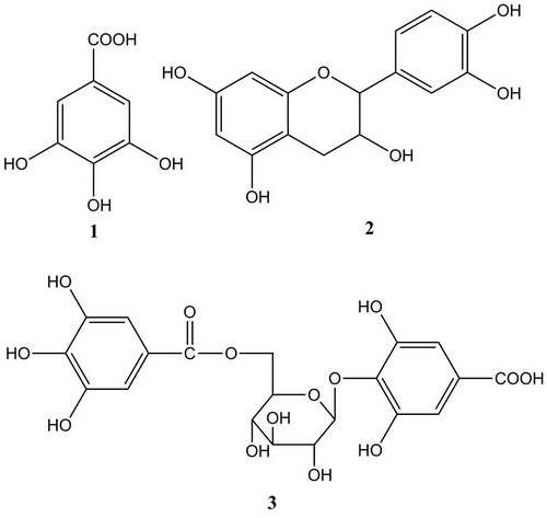 本研究首先通过大孔树脂技术成功富集了三种极性化合物。研究发现,采用常规溶剂系统进行分配系数摸索时,三种极性化合物均分布在水相,无法得到合适的分配系数。考虑到极性化合物可能为多羟基或含羧基化合物,本研究在常规乙酸乙酯-水系统里添加冰醋酸测试目标化合物的分配情况。结果表明,目标化合物对冰醋酸较为敏感。在采用乙酸乙酯-冰醋酸-水(100:1:100,v:v)为溶剂系统时,目标化合物可以获得理想的分配系数和分离因子,并且非目标化合物集中分配在了水相。最终,本研究通过高速逆流色谱,以乙酸乙酯-冰醋酸-水(100:1:100,v:v)为溶剂系统成功分离得倒了三种极性化合物,分别为没食子酸, 儿茶素, 和没食子酸4-O-β-D-(6′-O-没食子酰)-葡萄糖苷,印证了前期对目标化合物结构的猜想。