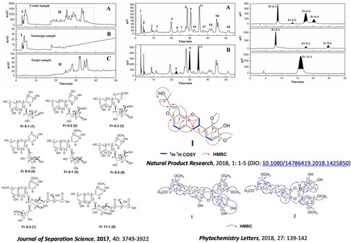“藏药新药研究与开发”学科组对苦马豆物质基础进行了研究,首先建立了固相萃取结合二维反相/亲水液相色谱方法纯化分离苦马豆中黄酮苷类化合物,同时从苦马豆中分离鉴定出1个新的异戊烯基异黄酮和2个新的茋类化合物,这些研究结果于2018年分别发表在了Journal of Separation Science,Natural Product Research和Phytochemistry Letters期刊上,这些研究成果的取得将为进一步开发利用苦马豆资源提供依据。