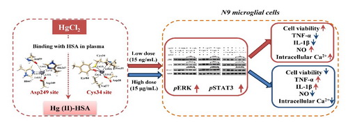 针对上述科学问题,该研究利用氯化汞和人血清白蛋白制备了Hg2+-人血清白蛋白复合物(Hg-HSA),随后探讨了Hg-HSA对神经小胶质N9细胞的生物学效应及其结合机制。研究发现,Hg-HSA对N9细胞增殖及炎症反应表现出类似于hormesis现象的双相调节作用,即低剂量Hg-HSA(15 ng/mL)能促进N9细胞增殖,提高NO和细胞内Ca2+水平,抑制炎症因子TNF-α和IL-1β的分泌,以及TNF-α mRNA和IL-1β mRNA的表达;而高剂量Hg-HSA(15 μg/mL)抑制N9细胞增殖,降低NO和细胞内Ca2+水平,促进炎症因子TNF-α和IL-1β的释放。上述作用主要通过ERK/MAPKs和STAT3信号通路实现。此外,通过量子化学计算发现,Hg2+在人血清白蛋白的Asp249和Cys34位点处能形成稳定的配位结构。尽管Hg2+在Asp249位点形成的五配位结构比在Cys34位点形成的四配位结构更稳定,但结合人血清白蛋白的空间结构考虑,Hg2+更易结合在Cys34位点。