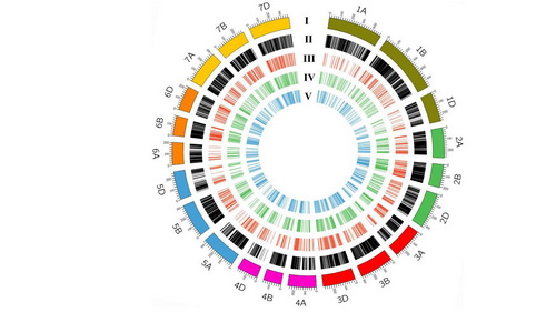 注:圈I代表小麦21条染色体;圈II代表多态性DArT标记;圈III代表分布于组合SCPD中的外源位点;圈IV代表分布于组合SS7M中的外源位点;圈V代表分布于组合SSYZ中的外源位点。