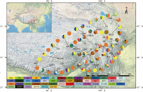 图1 山地虎耳草单倍型和基因型的地理分布图