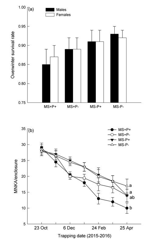 小哺乳动物镶嵌在复杂的食物网中,其适合度及种群波动必然受多种因素的影响。就小哺乳动物而言,身体状况较差的个体更易感染病原体,而病原体的感染又进一步恶化宿主的身体状况使,继而使其更易感染病原体直至死亡。因此,免疫与感染之间的恶性循环可能是影响小哺乳动物种群波动的重要因素。
