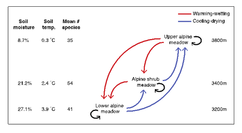 原位增温试验表明增温可能会导致生物多样性的丧失。然而,原位经历增温的物种可能最终会与追踪气候变化情景下相遇,从而共同影响生物多样性的变化模式。目前仍然不清楚物种获得与丧失相对物种丰富度的净变化。青海省寒区恢复生态学重点实验室客座研究员汪诗平、副研究员张振华和罗彩云,研究员周华坤、赵新全和李英年,联合中科院青藏高原研究所等单位的研究人员,利用双向移栽植物群落试验的10年长期观测数据,验证了气候以及追踪气候变化的群落将共同影响植物物种丰富度对气候变化响应的假设,揭示了高寒植被物种丰富度响应气候变化的一种生态机制。研究发现:在接受地群落从追踪气候变化的物种所获得的物种数不等同于原群落丧失的物种数,很好的解释了高寒植被物种丰富度对环境变化的响应机制。利用有物理障碍阻止植物扩散进行增温的试验可能高估了增温对植物多样性的负面影响,因为没有考虑到物种获得的情景。该研究强调并提出,在探讨气候变化对植物多样性影响时,除了要考虑环境因子外,还要考虑生物因子对植物多样性变化的影响。该研究发现,对于深入理解高寒植被气候-生态稳定性维持、高寒草地退化演替等意义重大。