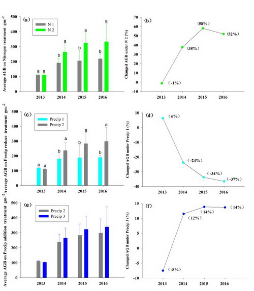 图1 N添加(a-b),降水减少(c-d)和降水增加(e-f)对地上生物量的影响