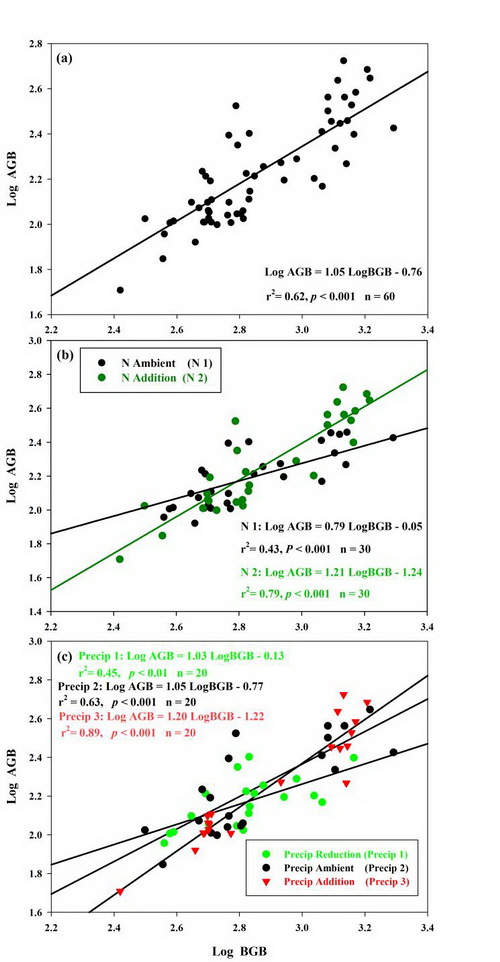 植物生物量分配有两个重要的分配假设:异速分配和等速分配。本研究以青藏高原高寒草原为研究对象,探讨了氮(N)添加和降水(Precip)变化对群落水平植物生物量分配的影响。本试验在青藏高原高寒草原上进行了为期4年(2013-2016)的野外控制试验,探究了两种假设以及群落生物量对N添加(10 g N m?2y?1)和Precip变化(± 50%降水)的响应。研究发现从2014年到2016年,植物群落生物量对N添加和Precip减少的响应不同,N添加显著增加地上生物量(AGB),而Precip减少显著减少AGB。此外,降雨减少增加了深层土壤地下生物量(BGB)。自然状态下的高寒草原,AGB和BGB的分配结果与等速分配假设一致。与此相反,氮添加或降水增加促进生物量向地上分配,从而导致异速生长。更重要的是,降水减少增加了深层土壤的生物量分配。我们的研究通过连接AGB和BGB分配,加深了高寒草原对全球气候变化响应的理解。