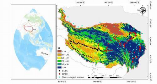 结果表明,青藏高原草地降水利用效率沿水热梯度呈单峰型分布,由干旱向半干旱呈递增趋势,由半干旱向湿润呈递减趋势。同时,干旱地区植被降水利用效率主要受降水和土壤氮对植被地上净初级生产力或降水利用效率的影响,而半干旱地区植被降水利用效率主要受气候(降水和温度)和土壤因子(土壤碳)对植被地上净初级生产力和覆盖度的影响。值得注意的是,干燥指数(AI)>55后高寒草地降水利用效率下降的原因仍有待进一步探索。因此,今后的研究应更多地关注青藏高原降水利用效率的模式和控制途径,这对制定高寒草地生态系统科学的管理制度和保护策略具有重要的指导作用。
