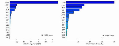 图3. 环境因子对青藏高原降水利用效率(PUE)的影响,包括干燥指数(AI)、年平均降水量(AMP)、年平均温度(AMT)、生长期温度(GST)、年生物温度(ABT)、土壤有机碳(SOC)、土壤全氮(STN)、土壤全磷(STP)、土壤有效氮(SAN)、土壤有效磷(SAP)、微生物辛普森指数(MS);植被特征分别为净初级生产力(ANPP)、地下生物量(BGB)和植被覆盖度(COV)。