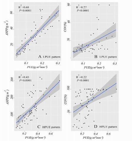 图4.净初级生产力(ANPP)与降水利用效率(PUE)、植物覆盖度(COV)和降水利用效率(PUE)之间的关系。图A和图B分别表示低PUE (LPUE)模式下的关系;图C和图D分别代表高PUE (HPUE)模式下的关系。
