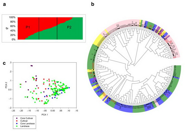 核心种质反映了种质资源的多样性,使遗传资源评价更加有效。为提高青藏高原地区青稞种质资源的管理水平,麦类作物分子育种学科组基于204份(39份育成品种和165份地方品种)广泛分布青藏高原的青稞,利用均匀覆盖大麦7条染色体的1750个SNP标记,确定了20%的抽样比例(即41份青稞)构建核心种质。采用5种不同的方法(Mstrat、Random、REMC、SBS和SFS)构建了5个不同的核心种质库。通过对其代表性进行评价和分析,最终确定由Mstrat方法构建的核心种质库(由11份育成品种和30份青稞地方品种组成)在遗传结构和多样性方面均具有较好的代表性。最后,筛选出分布在7条染色体上的28个SNP可以区分204份青稞的遗传关系,可为青稞品种进行鉴定和品种纯度检测提供分子证据。总之,核心种质的构建有利于种质资源的长期保存,也可以为青稞的遗传改良提供有效支持。