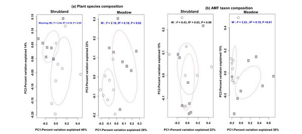 注:第一个(PC1)和第二个成分(PC2)得分系数从PCoA提取被用来表征不同处理之间的植物或AMF群落的差异。蓝线和红线分别代表对照和增温处理的95%置信椭圆。