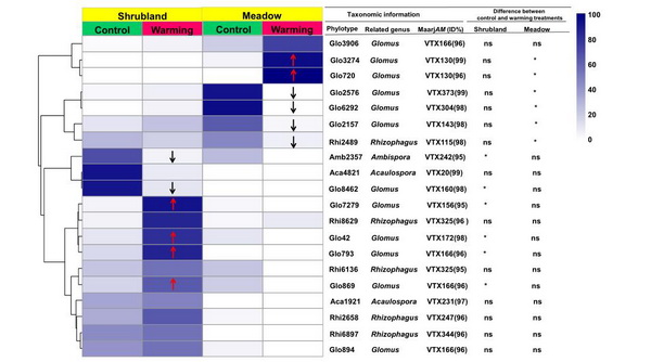 注:右图显示了各生境中对照和增温处理的AMF系统型相对丰度的差异。
