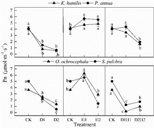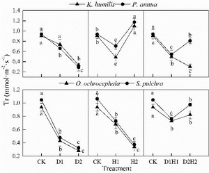 图1. 干旱、高温及其组合胁迫对矮生嵩草(Kobresia humilis)、黄花棘豆(Oxytropis ochrocephala)、冷地早熟禾(Poa annua)和美丽风毛菊(Saussurea pulchra)净光合速率和蒸腾速率的影响