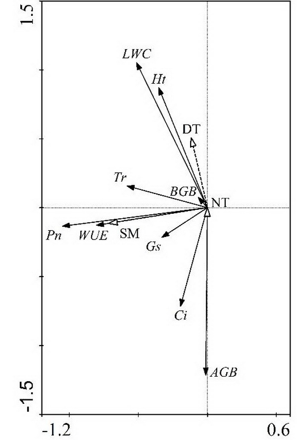图2 植被特征(实线)与环境因子(虚线)的冗余分析排序图