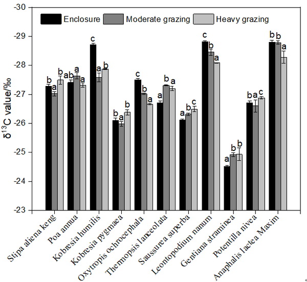水分利用效率是影响草地生态系统生产力及草地健康状况的重要指标。放牧是高寒草甸最重要利用方式,长期超载放牧是引起草地退化的主要原因。适度放牧可以提高草地资源利用率、提升植物群落物种丰富度和多样性。稳定碳同位素δ13C值可用来指示植物长期水分利用效率变化。
