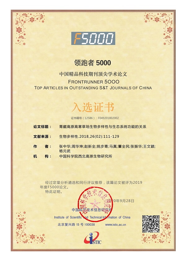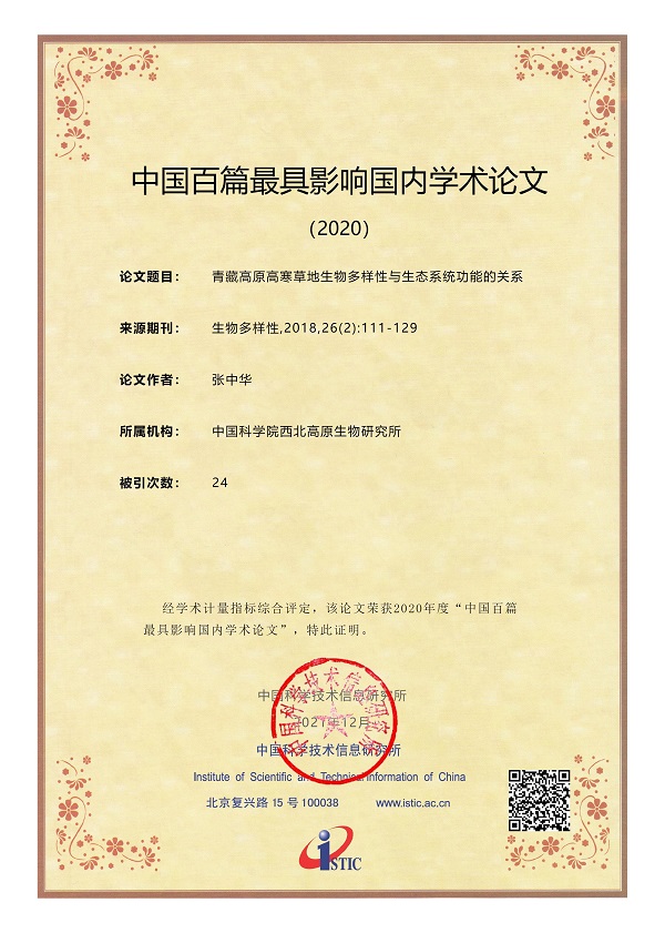 中国科学技术信息研究所2021年12月发布的《中国科技论文统计报告2021》(https://www.istic.ac.cn/isticcms/html/1/284/338/6905.html)“中国卓越科技论文报告”显示,中国科学院西北高原生物研究所博士生张中华、研究员周华坤、研究员赵新全等人在《生物多样性》发表的论文“青藏高原高寒草地生物多样性与生态系统功能的关系”入选“2020年中国百篇最具影响国内学术论文”,目前被引次数29,显示了该论文较好的科学价值和参考意义,入选论文如下: