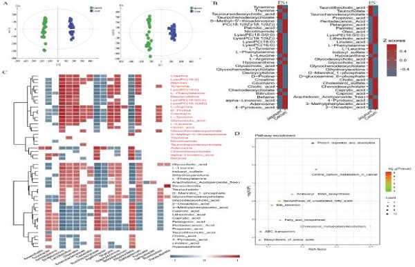 图4 不同食物纤维下,八眉猪盲肠微生物代谢产物的差异分析