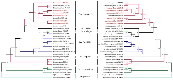 乌头属多倍化、杂交和基因流交流频繁,导致物种形成和遗传分化的研究难度较大。铁棒锤(Aconitum pendulum)和伏毛铁棒锤(A. flavum)是乌头属(Aconitum L.)多年生的草本植物,主要分布在青藏高原及其毗邻地区。两种铁棒锤形态特征及其相似,是研究青藏高原区域物种形成和演化历史的理想材料。利用二代测序技术获取铁棒锤与伏毛铁棒锤的叶绿体基因组。通过叶绿体基因组结构比较,铁棒锤与伏毛铁棒锤在叶绿体基因组的基因内容、基因顺序、GC含量、密码子偏好性、IR/SC边界的扩张和收缩等方面具有微小的差异。系统发育分析结果表明铁棒锤与伏毛铁棒锤并未按照形态物种聚类,不是相互独立的单系(图2;Biologia, DOI: 10.1007/s11756-021-00969-6, 2022)。