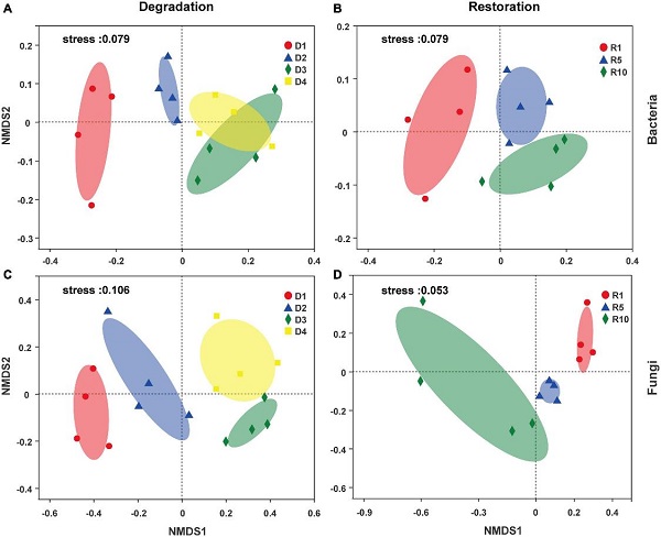 OTU水平上微生物群落在退化/恢复梯度的非度量多维尺度图(NMDS)