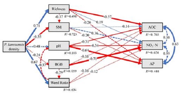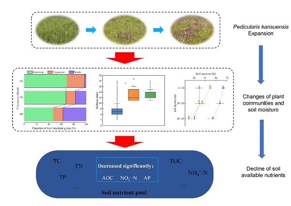 气候变化和人类活动的影响引起了高寒草地的退化,其中毒杂草入侵是草地退化的重要指示因子。中国科学院西北高原生物研究所青海省寒区恢复生态学重点实验室研究团队以甘肃马先蒿为研究对象,对其种群扩张不同阶段展开研究。结果发现,甘肃马先蒿种群扩张显著增加了群落丰富度指数、Shannon-Wiener指数和杂类草的地上生物量比例(p<0.05),而群落总生物量,禾本科和莎草科植物地上生物量比例未见显著降低(p>0.05);土壤水分、AOC和NO3-·N显著降低(p<0.05),而土壤pH和土壤全量养分变化不显著,有效磷(AP)先降低后升高(p<0.05)。SEM模型表明甘肃马先蒿种群扩张导致物种丰富度、杂类草地上生物量比例和群落需水量增加,进而促进土壤有效养分的过度利用,最终导致土壤质量下降。本研究阐明了高寒草地毒杂草入侵爆发的一种生态机制,为草地管理提供了科学依据和理论指导。