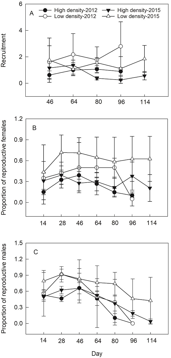 图2 2012年和2015年种群补充率(A)、雌性的繁殖状态比例(B)和雄性的繁殖状态比例(C)