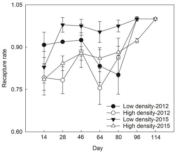 为了验证该假设,中国科学院西北高原生物研究所小哺乳动物种群调节及鼠害生物防治学科组以根田鼠为研究对象,在野外大型封闭式围栏,通过建立高密度和低密度围栏种群,测定了不同密度处理个体的粪便皮质酮含量、种群补充率、繁殖状态比例及种群数量,以分析密度应激在密度制约性繁殖中的作用。