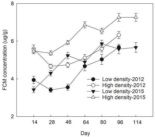 结果发现,在2年的重复实验期间,高密度围栏的种群数量始终显著高于低密度围栏的种群数量,且高密度围栏的种群补充率和繁殖状态比例均显著低于低密度围栏种群,而高密度围栏种群的粪便皮质酮含量显著高于低密度围栏种群,表现为种群密度与繁殖呈负相关,与粪便皮质酮呈正相关。通过构建结构方程模型发现,种群密度可通过个体粪便皮质酮水平而影响种群的补充率以及雄性个体的繁殖状态。
