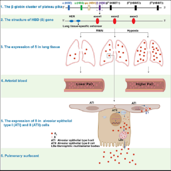 近日,中科院西北高原生物研究所张同作研究组与青海大学魏登邦研究组、中科院昆明动物研究所施鹏研究组合作在Cell Reports(IF=9.99)发表了题为A homotetrameric hemoglobin expressed in alveolar epithelial cell increases blood oxygenation in high-altitude plateau pika (Ochotona curzoniae) 的研究论文,该论文在高原鼠兔肺表面活性物质中发现了一种高含量的同源四聚体血红蛋白,明确了该蛋白的编码基因、在肺组织中的表达特征和水平、该蛋白合成和分泌的细胞及其在肺表面活性物质中的相对含量以及在肺组织中发挥的功能。研究结果表明,高原鼠兔肺组织中的同源四聚体血红蛋白由HBD(δ)控制合成,在高原鼠兔肺组织中特异性表达,低氧显著上调HBD的表达;在高原鼠兔肺泡上皮I和II型细胞中特异性表达,通过板层小体分泌到肺泡腔中,成为肺表面活性蛋白的主要成分;抑制肺组织中HBD的表达导致高原鼠兔红细胞增生、血红蛋白和血液黏度增大,血液中乳酸浓度显著提高,该蛋白对高原鼠兔从低氧环境中获取氧发挥着重要的作用。研究结果对肺表面活性物质蛋白成分组成和功能理论做出了重要补充;修正了“血红蛋白只在红细胞中表达”的古老概念;有力佐证了“血红蛋白非红细表达和非协同表达”的理论。