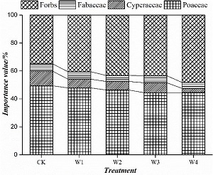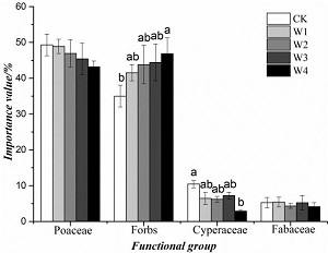 图1 模拟梯度增温下高寒草甸植物功能群重要值变化