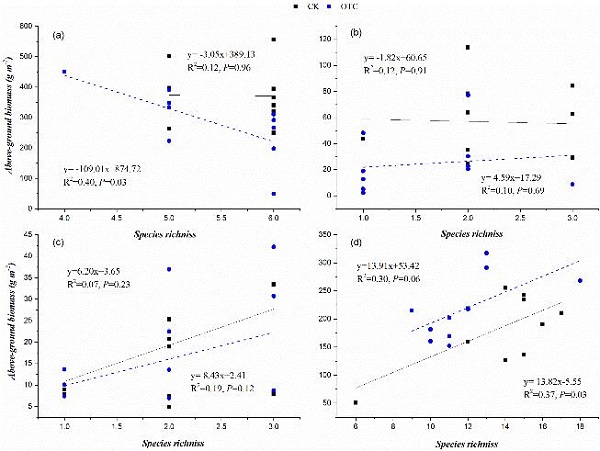 图2 功能群植物物种丰富度与地上生物量关系在对照和模拟增温下的变化