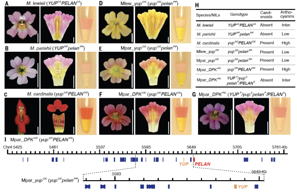 物种特异性小RNA位点在真核生物基因组中广泛存在,但它们在谱系特异性适应、表型多样化和物种形成中的作用尚不清楚。本研究针对三种不同授粉特性的猴面花物种,直接摒弃基于M. lewisii 与M. cardinalis 构建杂交群体发掘YUP 位点的传统方法,巧妙引入自花传粉的M. parishii,将这三个物种经一系列杂交、回交和自交,并适时结合表型和基因型选择,成功获得了Mlew_yupC/CpelanP/P 近等基因系。再通过对相关材料进行基因组测序组装、共线性分析、功能验证和遗传进化分析等确定了YUP 候选基因。研究显示,猴面花(Mimulus )的这个经典物种形成位点YELLOW UPPER (YUP )为物种特异性小RNA位点它包含一个反向重复区域,可以产生阶段性的小干扰RNAs (siRNAs)。其中一种siRNA 通过抑制类胡萝卜素生物合成和有色体发育的主要调节因子来调控花的色素沉着。YUP 与另外两个基因一起在大约五百万年前起源于Mimulus 一个亚分支的共同祖先,作为一个“超级位点”控制花朵颜色,并在后代物种的花色多样化和传粉媒介介导的生殖隔离中发挥了关键作用。这些结果证明了物种特异性非编码基因在后续生物进化中的重要性。