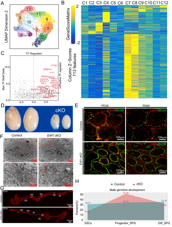 A:未分化精原细胞聚类TSNE图;B: 细胞簇特异peaks聚类热图;C:基因表达分数与转录因子motif结合预测的正向调控转录因子;D: 2月龄对照和E4f1 cKO小鼠的睾丸;E:对照组和E4f1 cKO小鼠睾丸切片未分化精原细胞和支持细胞免疫荧光染色;F: 对照和E4f1 cKO小鼠生殖细胞的透射电子显微镜图像;;G:对照和E4f1 cKO小鼠生精小管的As、Apr和Aal精原细胞比例;H:基于单细胞转录组数据的细胞分型及比例