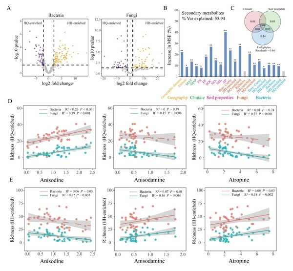 环境因子对山莨菪根部莨菪烷类生物碱含量的影响。(A) 利用edgeR分析鉴定不同区域差异OTUs;(B) 基于随机森林分析的环境因子对莨菪烷类生物碱含量的影响;(C) 方差分解探究气候因子、土壤因子和微生物对莨菪烷类生物碱变异的贡献;(D)横断山-祁连山区域富集的内生真菌与莨菪烷类生物碱含量的回归分析;(E)横断山-喜马拉雅山区域富集的内生真菌与莨菪烷类生物碱含量的回归分析