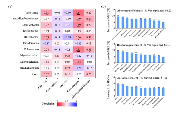 中国科学院西北高原生物研究所高原药用资源生态保护与繁育学科团组通过16S和ITS高通量扩增子序列测定了山莨菪根际土壤和根中的细菌和真菌群落的组成。方差分解结果表明,根内生菌单独解释了莨菪烷类生物碱14%的变异,是最大的贡献者,其次土壤性质单独解释了5%的变化,气候变量解释了1%的变化。其中,内生真菌解释了11%,而细菌仅解释了5%。随机森林和Mantel检验表明,不同区域富集的内生真菌对莨菪烷类生物碱积累的影响大于整个内生真菌。进一步发现山莨菪根选择性地招募了一个核心细菌群落,通过条件筛选,获得102个根核心细菌OTUs,虽然数量只占总数的2.99%,但相对丰度却占总数的73%。Spearman相关分析和随机森林分析表明,山莨菪根核心细菌组成和多样性与山莨菪根樟柳碱含量、地上生物量和氮含量显著相关。其中,Rhizobacter、Variovorax、Polaromona、Polaromonas 和 Mycobacterium 等在根中显著富集的细菌类群起主要作用。FAPROTAX功能预测表明,氮循环细菌和病原菌与樟柳碱含量、地上生物量和氮含量密切相关。该研究揭示了山莨菪根部莨菪烷类生物碱与细菌和真菌中部分类群之间的强烈关联,鉴定了对特定莨菪烷类生物碱累积具有重要作用的关键微生物类群。