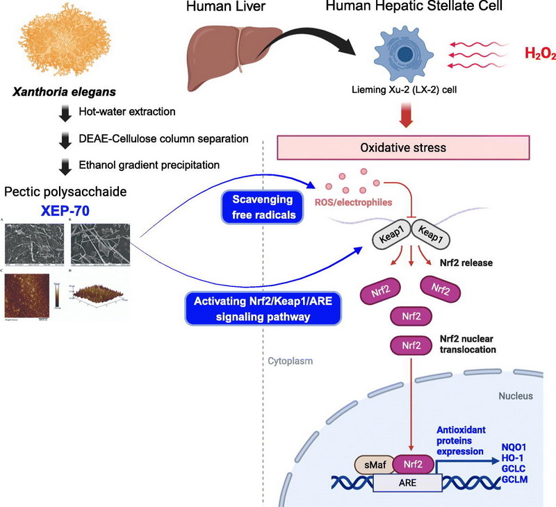 中国科学院西北高原生物研究所高原藏药资源质控与药理毒理评价研究团队从丽石黄衣中分离、筛选得到一种具有抗氧化活性的果胶类杂多糖XEP-70,其分子量(MW)为 430.98 kDa,由(1→4)-linked和(1→4,6)-linked α-D-Glcp、 (1→4)-linked α-D-GalpA、(1→2)-linked, (1→6)-linked和(1→2,6)-linked α-D-Manp;、(1→6)-linked和(1→2,6)-linked β-D-Galf等糖基连接组成。药理活性研究表明,XEP-70具有一定的自由基清除能力和还原力,以及显著的人肝星形细胞(LX-2)氧化损伤保护作用。其肝细胞氧化损伤保护作用,主要是通过激活LX-2细胞Nrf2/Keap1/ARE信号通路,随后促进下游NQO1、HO-1、GCLC和GCLM等抗氧化相关蛋白表达来实现的。该研究为丽石黄衣及其多糖成分在氧化损伤相关肝脏疾病防治中的进一步应用提供科学依据。