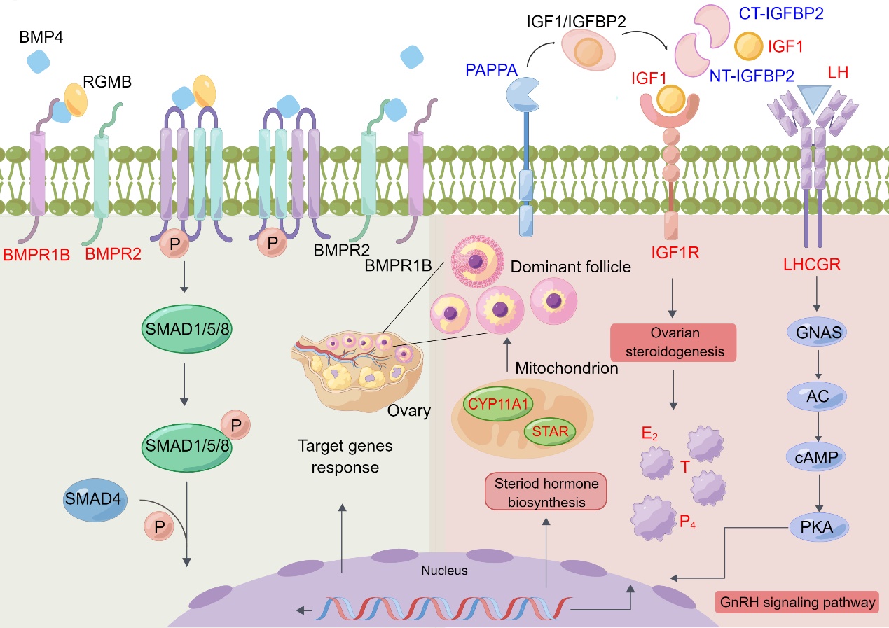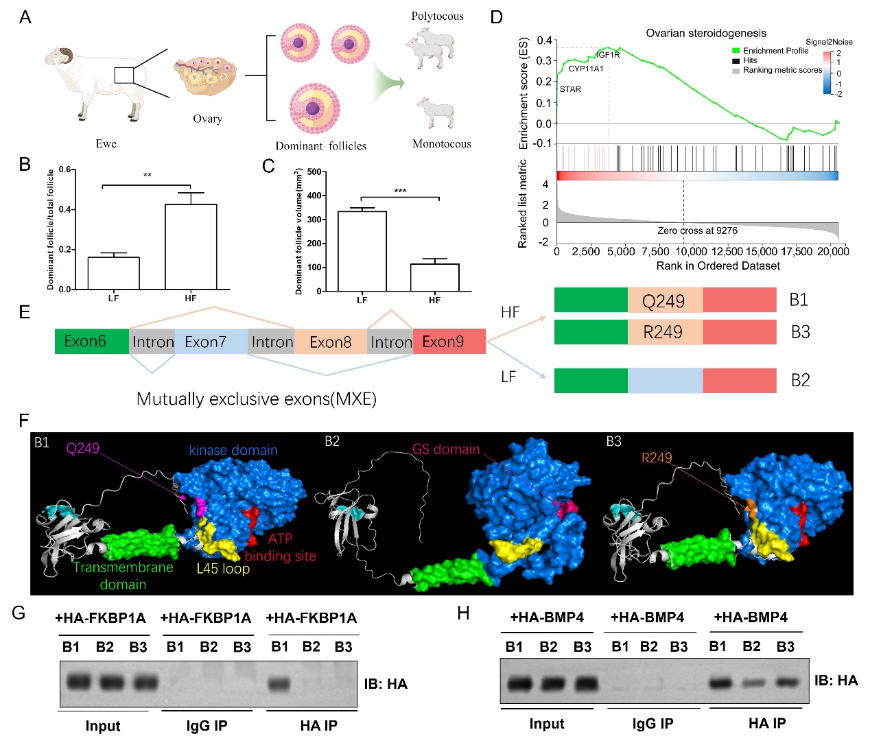 中国科学院西北高原生物研究所动物生态与资源保护研究团队针对绵羊重要繁殖性状(产羔数和产羔间隔),以连续三个产羔季节产多胎(每胎产两羔或三羔,HF)和产单胎(每胎产一羔,LF)的藏羊为研究对象,整合全基因组关联分析、普通转录组学、单细胞转录组学、蛋白质组学和代谢组学等多组学研究方法,结合KASP基因分型、实时荧光定量PCR、酶联免疫吸附实验、免疫共沉淀和蛋白质免疫印迹等分子功能验证实验,挖掘藏羊产羔数和产羔间隔关键调控元件并揭示其高繁殖力的遗传调控机制。全基因组关联研究表明,BMPR1B基因与产羔数性状相关,PAPPA基因与产羔间隔性状相关。首次构建了藏羊卵巢单细胞图谱,发现关键基因PAPPA特异性表达在壁层颗粒细胞亚群,且BMPR1B基因在壁层颗粒细胞和固醇生成颗粒亚群高表达。基于单细胞转录组学、蛋白质组学和代谢组学整合分析,发现PAPPA是刺激卵巢优势卵泡生长发育和类固醇生成的关键候选基因。繁殖主效基因BMPR1B除了非同义突变,首次在藏羊中发现BMPR1B还存在可变剪接事件调控多胎性状。该研究结果对分子精准选育提升藏羊繁殖力和实现藏羊产业提质增效具有重要意义。